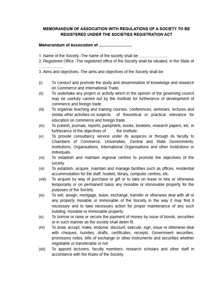 Memorandum of Association With Regulations of A Society To Be Registered Under The Societies