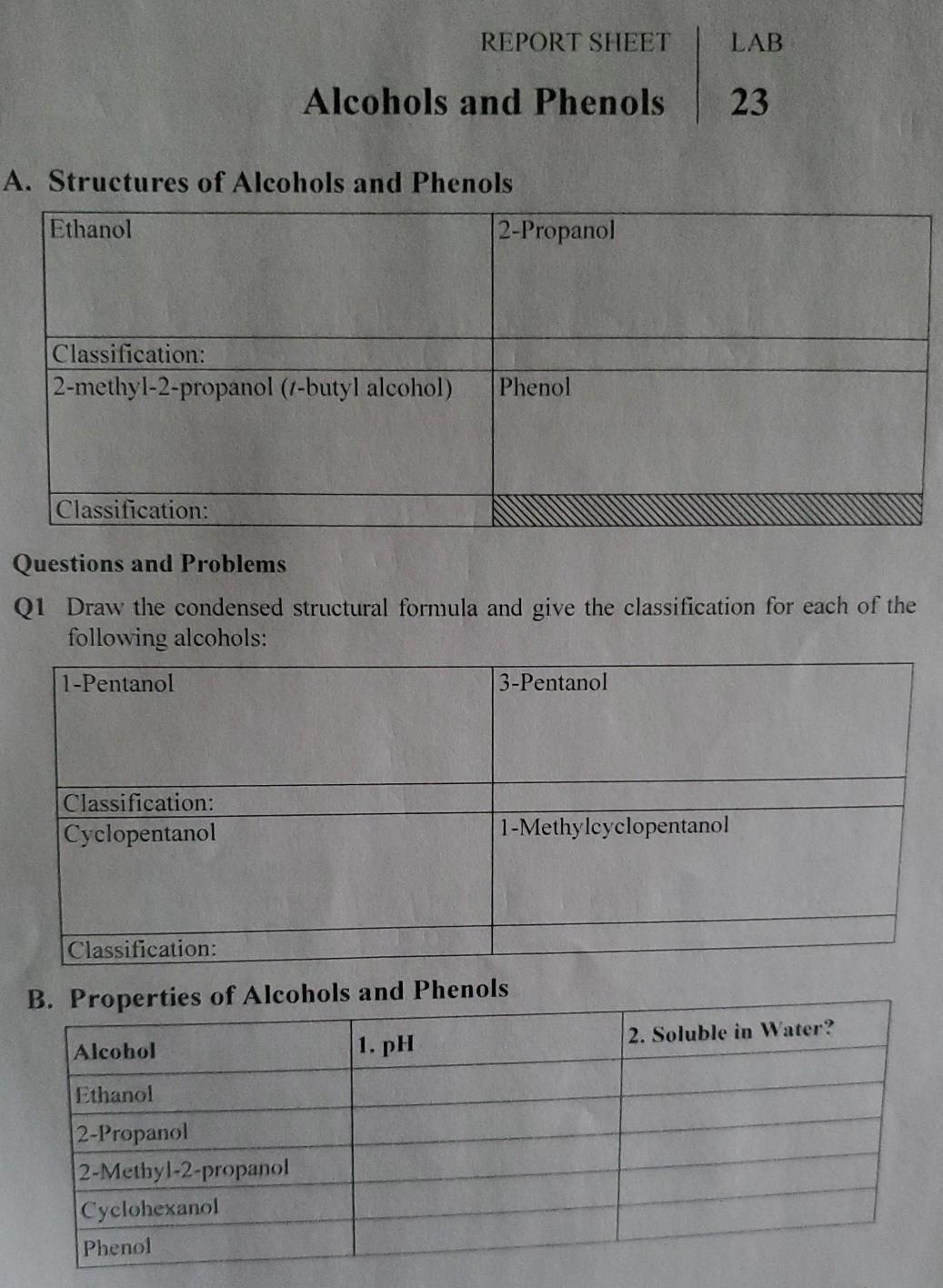 Solved REPORT SHEET LAB Alcohols and Phenols 23 A.