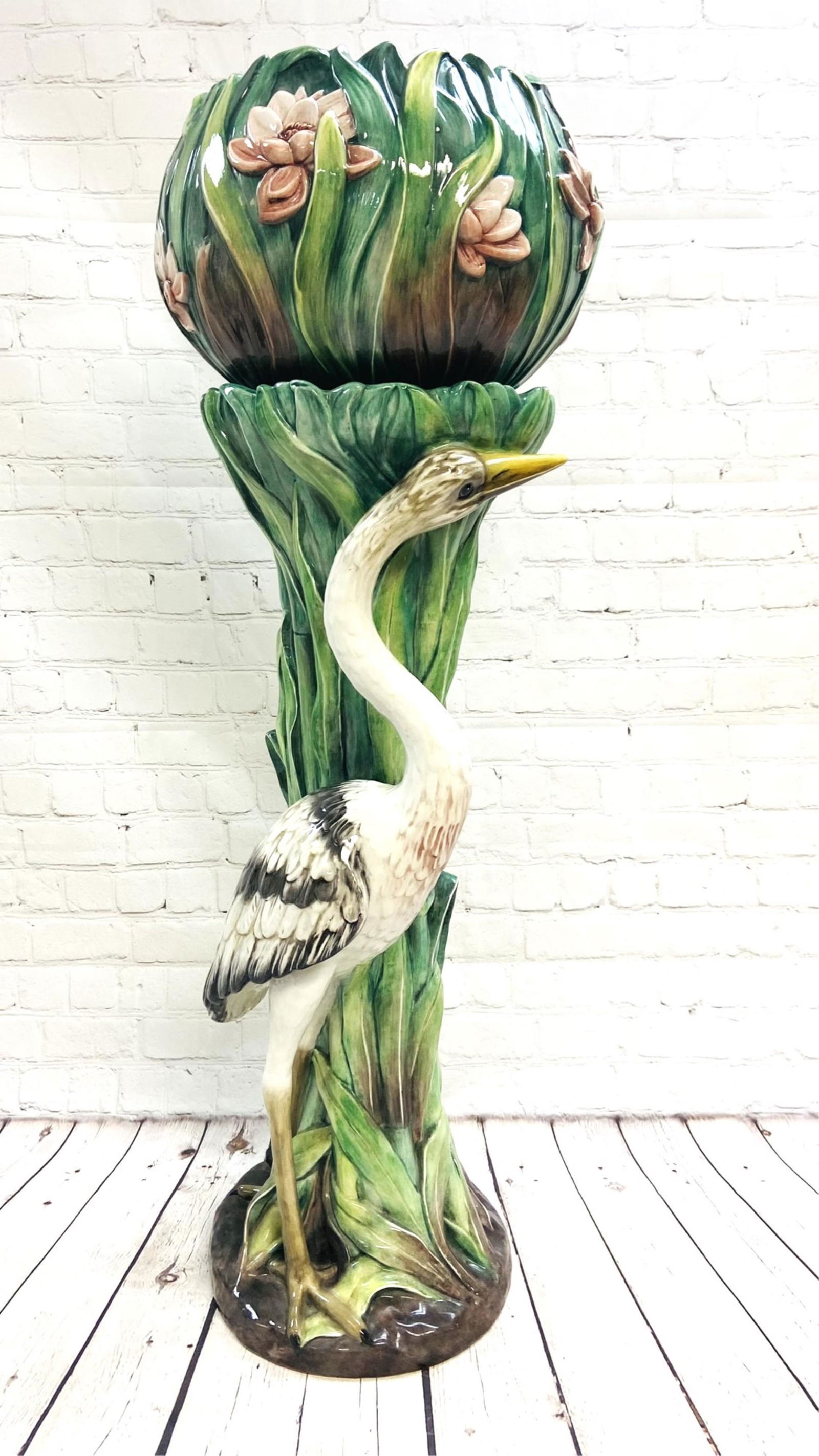 Vintage French Majolica Crane Pedestal Jardiniere