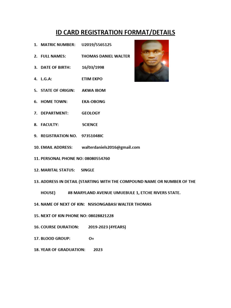 Thomas Daniel Walter Id Card Registration Form PDF