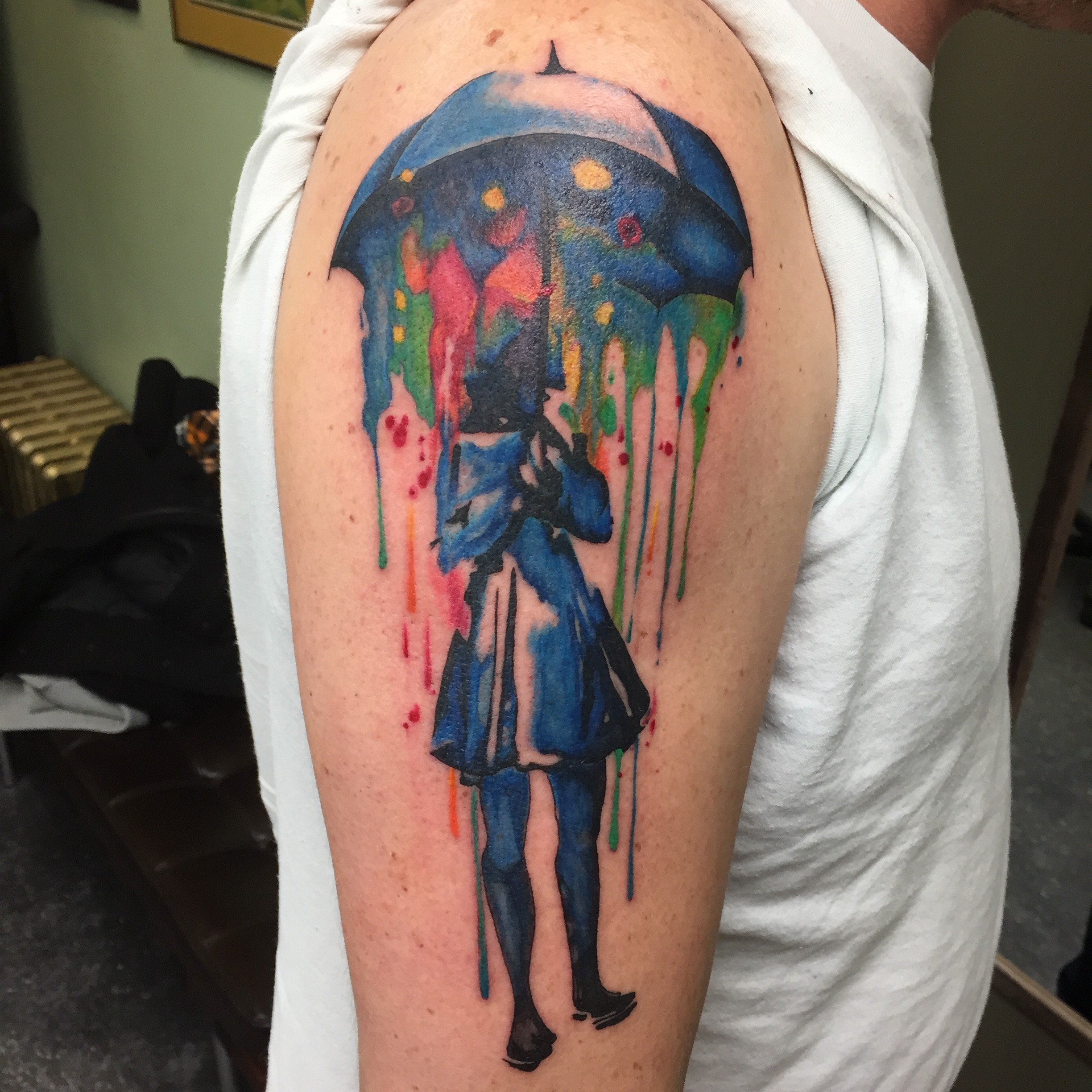 A traditional color tattoo of an umbrella, done by NiceJesTattoos Umbrella Girl Tattoo Umbrella tattoo designs might look juvenile to some, but they are one of the few designs that reflect an array of meanings. Some people like them more for their cute look in tattoo form, while others love the symbolism that the image brings with it. Then this list would be perfect. Arrow design by me and umbrella design by adam. Umbrella Girl Tattoo.