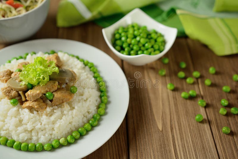 Rice with Pork, Mushrooms, Pea and Sauce Stock Image Image of fork Pea And Mushroom Sauce It's an easy dish, but fancy enough for a sunday dinner or holiday feast. Melt butter in a skillet over medium heat. Add the garlic, onions, mushrooms, red pepper flakes and basil. The mushrooms and onions are cooked together and then combined with the roux and sauce mixture. A small amount of nutmeg gives the sauce additional flavor. Heat a. Pea And Mushroom Sauce.
