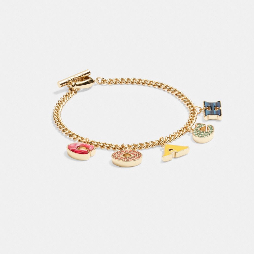 COACH® Coach Codes Charm Bracelet COACH® Coach Starter Charm Bracelet Its finished with a toggle closure. Mix and match favorite coach charms or wear alone. Customize your own look with our link bracelet. Mix and match favorite coach charms or wear alone. Featuring some of our most iconic motifs, this charm bracelet adds signature style to any look. A pair of stylish, designer earrings of course! Customize your own look. Coach Starter Charm Bracelet.
