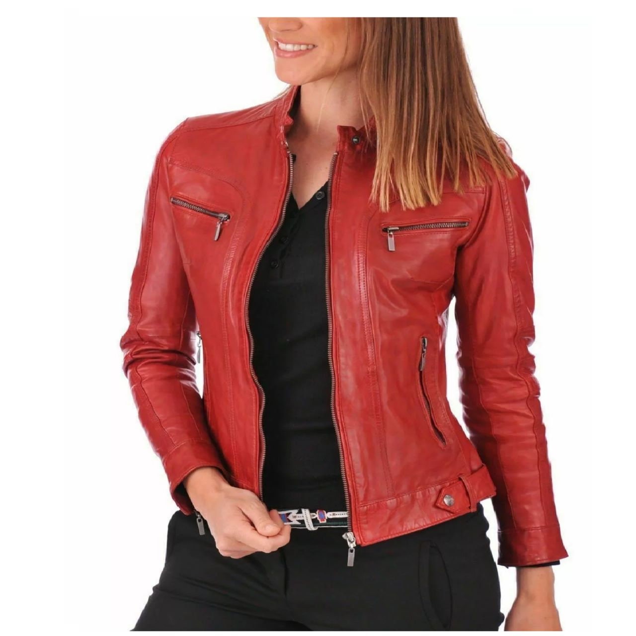 Genuine Leather Jacket Motorcycle Leather Jacket Women Red Leather