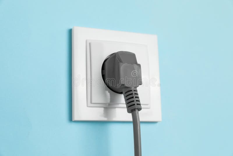 Power Socket with Inserted Plug on Light Blue Wall, Closeup. Electrical