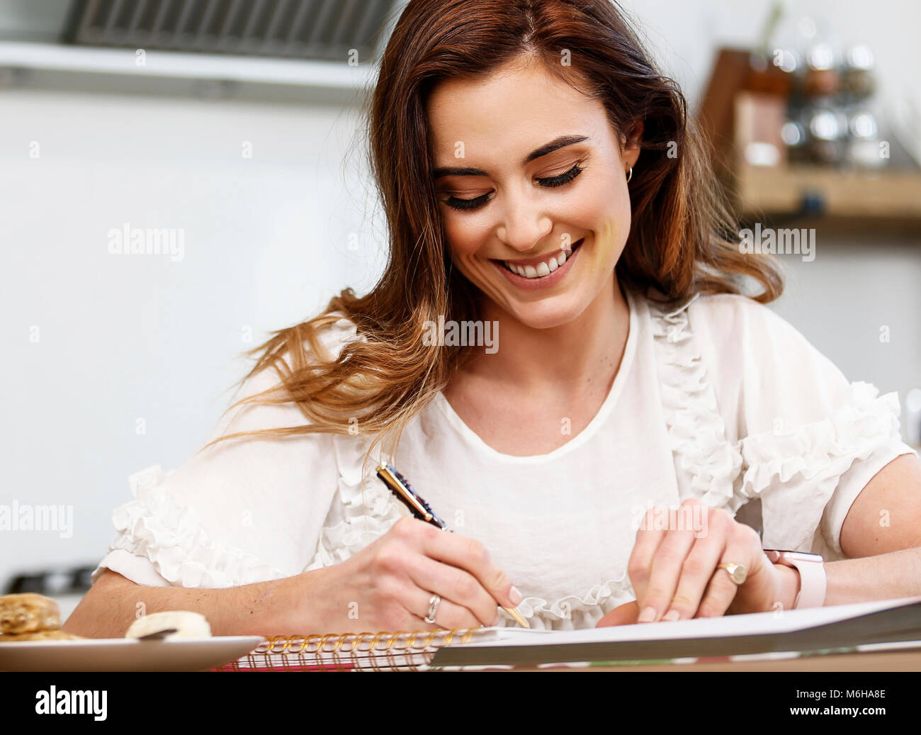 A beautiful young woman writing recipe notes in the kitchen Stock Photo