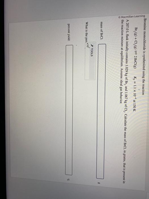 Solved Ive Ups Bromine monochloride is synthesized using Bromine Monochloride Is Synthesized Using The Reaction Calculate the mass of brcl, in grams, that is present in the reaction mixture at equilibrium. Bromine monochloride is synthesized using the reaction br2(g)+cl2(g)↽−−⇀2brcl(g) 𝐾p=1.1×10−4 at. Set up an ice table (initial, change, equilibrium). For initial figure the pressures of each reactant. You will need to use the. Calculate the mass of brclbrcl, in grams, that is present in the. Bromine Monochloride Is Synthesized Using The Reaction.