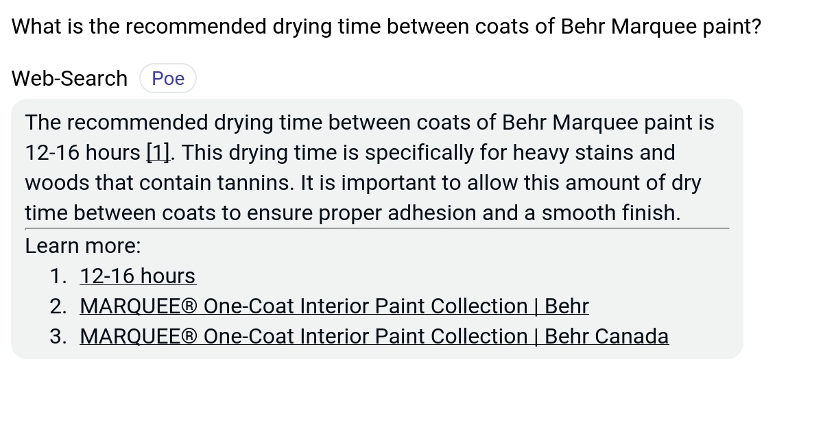 What is the drying time between coats of Behr Marquee paint? Poe