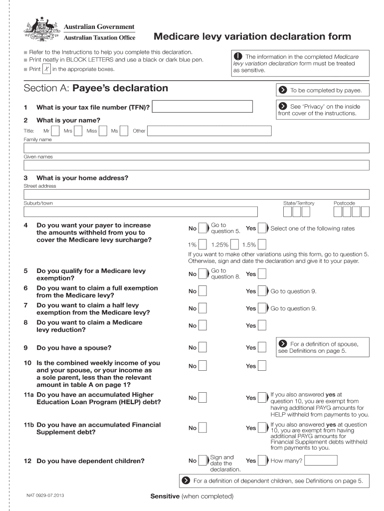 Fillable Online ato gov Medicare levy variation declaration