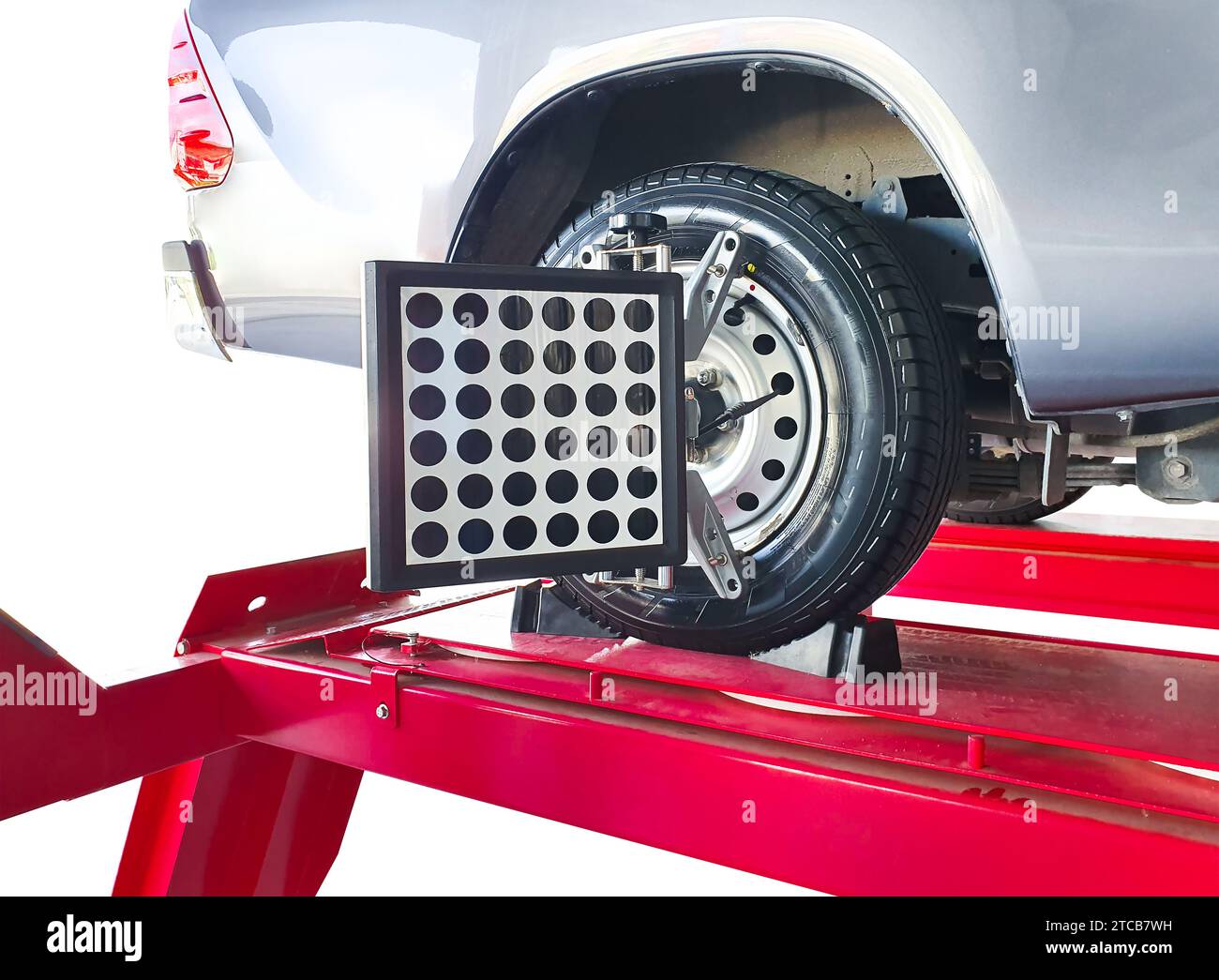 Wheel alignment of car on lifting stand with a laser sensor during