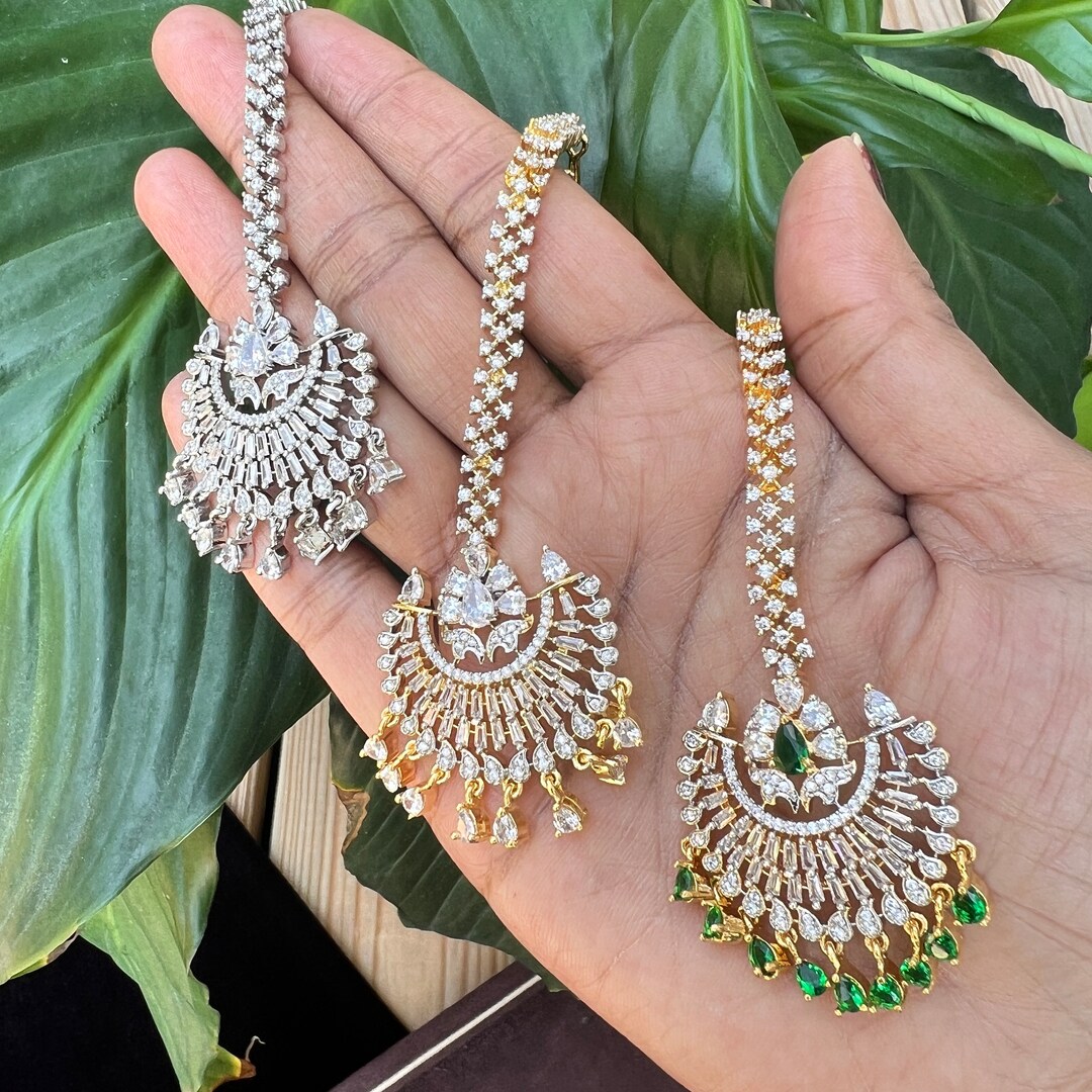 Hair Chain Accessory Bridal Crystal Tikka Headpiece Silver Etsy Indian Jewelry Tikka From the most extravagant to the most basic, every bride. Make a statement with this bold and beautiful indian jewelry tikka set, featuring large maang tikka and chandelier. Indian jewelry stores in virginia carries necklace, tikka, nose rings, bracelets, earrings, mangalsutra and bangles and much more!! Discover the beauty of real gold tikkas, adorned with diamonds and gemstones. One of. Indian Jewelry Tikka.