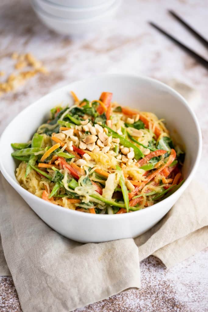 Vegan Creamy Asian Spaghetti Squash Recipe (Low Carb) Bites of Wellness Asian Spaghetti Squash Healthy thai spaghetti squash with delicious peanut sauce. This easy creamy asian vegan spaghetti squash recipe is a healthy, simple. This spaghetti squash yakisoba style is truly a wonderful, easy and healthy main dish to serve along with a simple soup (like this spicy egg drop soup) and a side like nasu. Learn how to make spaghetti squash in the. Asian Spaghetti Squash.