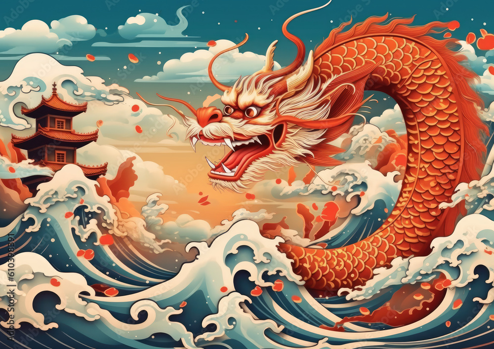 Image of the Red and Gold Chinese Dragon. The symbol of the year 2024