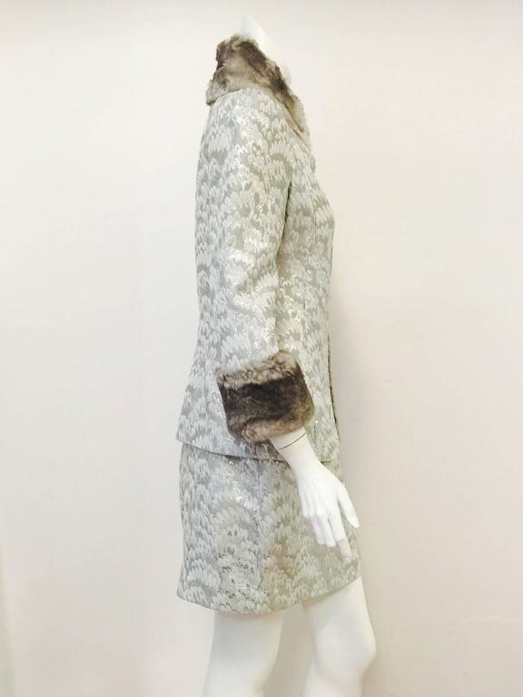 Dolce and Gabbana Rabbit Trimmed Platinum Metallic Brocade Skirt Suit