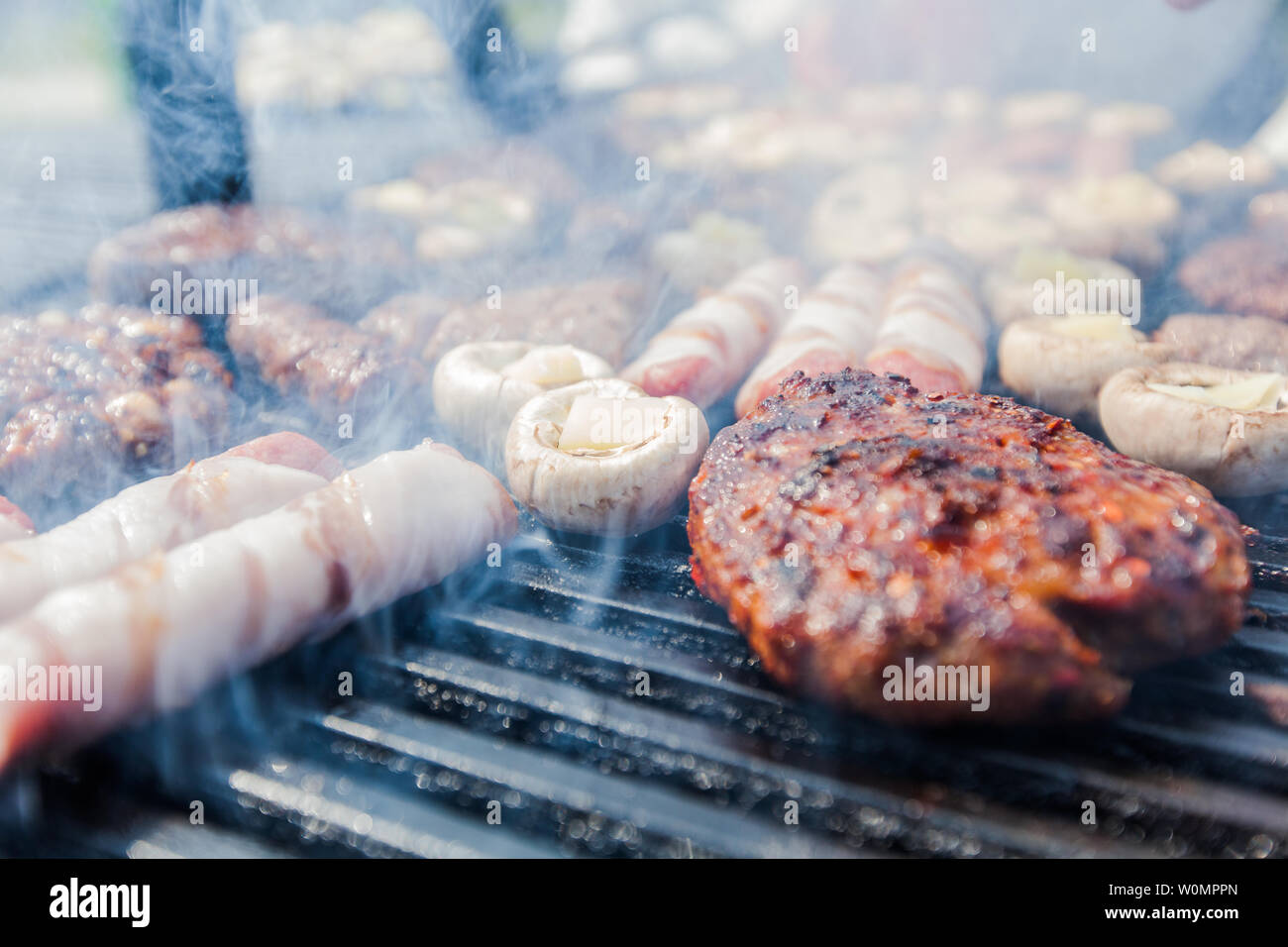 Grilled meat on barbecue at picnic Stock Photo Alamy