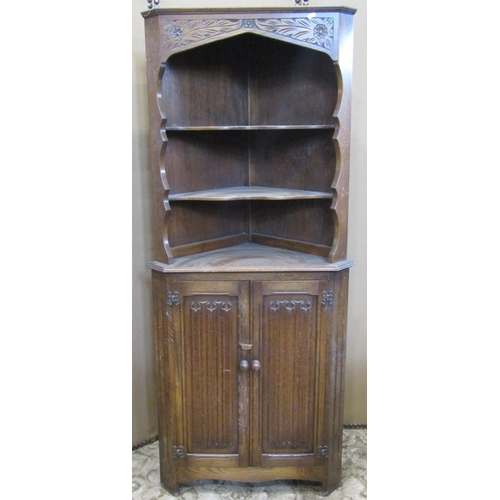 A reproduction oak freestanding corner cupboard enclosed by Barnebys