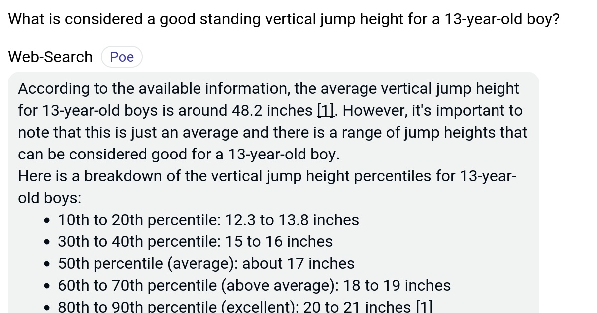 What is considered a good standing vertical jump height for a 13year