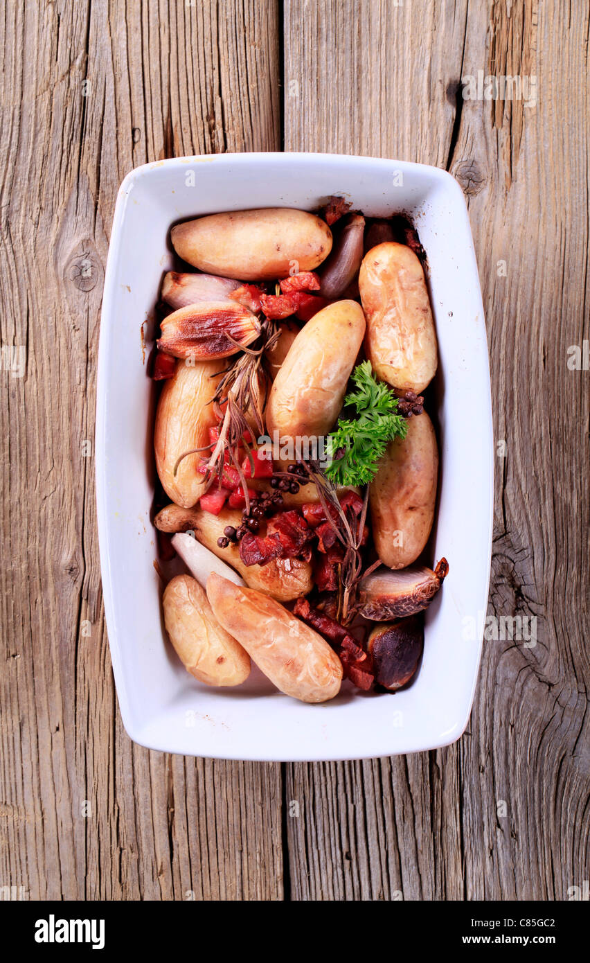 Baked potatoes and onion with diced bacon and rosemary Stock Photo Alamy