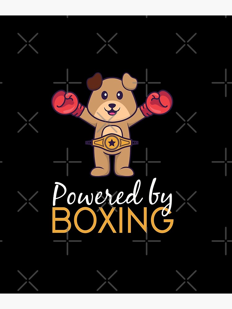 "Powered by boxing, funny dog in boxer costume, design for boxing/dog