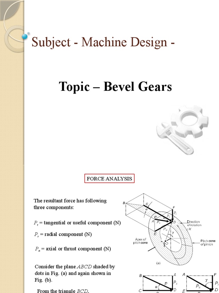 BEVEL GEARSBEVEL GEARSGEOMETRY OF BEVEL GEARSGEOMETRY OF BEVEL Bevel Gear Force Analysis This document discusses the force analysis of bevel gears. Spur gears only generate forces in the gear plane, however helical gears generate an axial force component therefore. It begins by introducing bevel gears and their use in transmitting motion between intersecting shafts. Possibilities of bevel and hypoid gears. This is the first book to offer a complete presentation of bevel. Bevel Gear Force Analysis.
