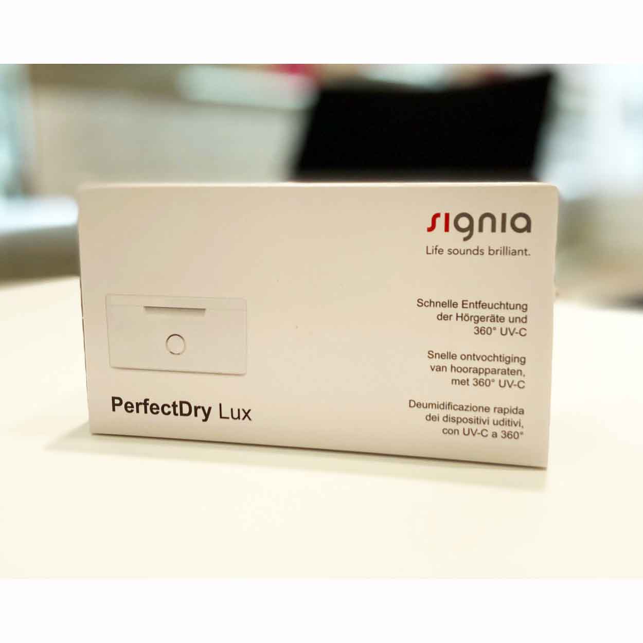 Perfectdry Lux Perfectdry lux is a device that dehumidifies and disinfects hearing aids in 45 minutes. Daily use results in improved acoustic performance, better reliability, and better ear hygiene. Pulsed hot air dehumidification system for an optimized and even flow. Perfectdry lux is a device that can disinfect and charge hearing aids with zpower batteries. Perfectdry is the most affordable hearing device. Perfectdry Lux.