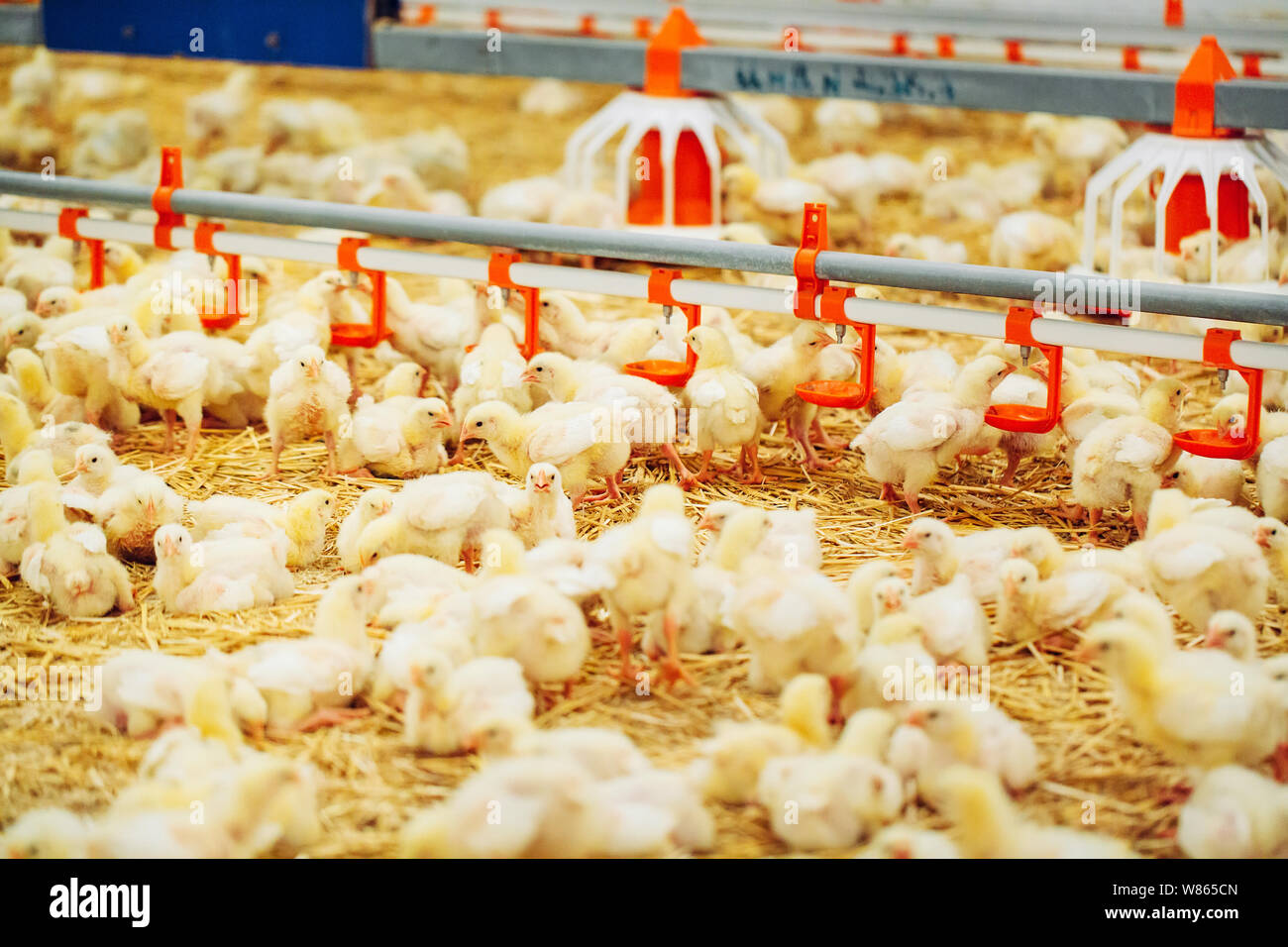 Indoors chicken farm, chicken feeding, large egg production Stock Photo