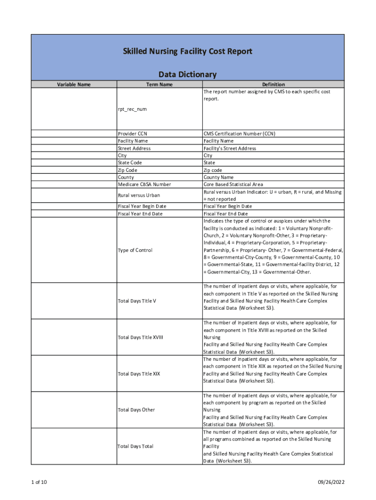 Fillable Online Skilled Nursing Facility Cost Report Data Dictionary