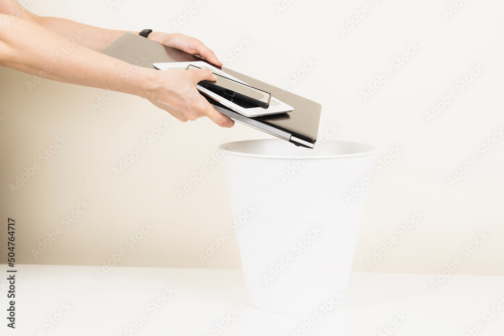Hand puts used laptop computer, digital tablet and cell phones into