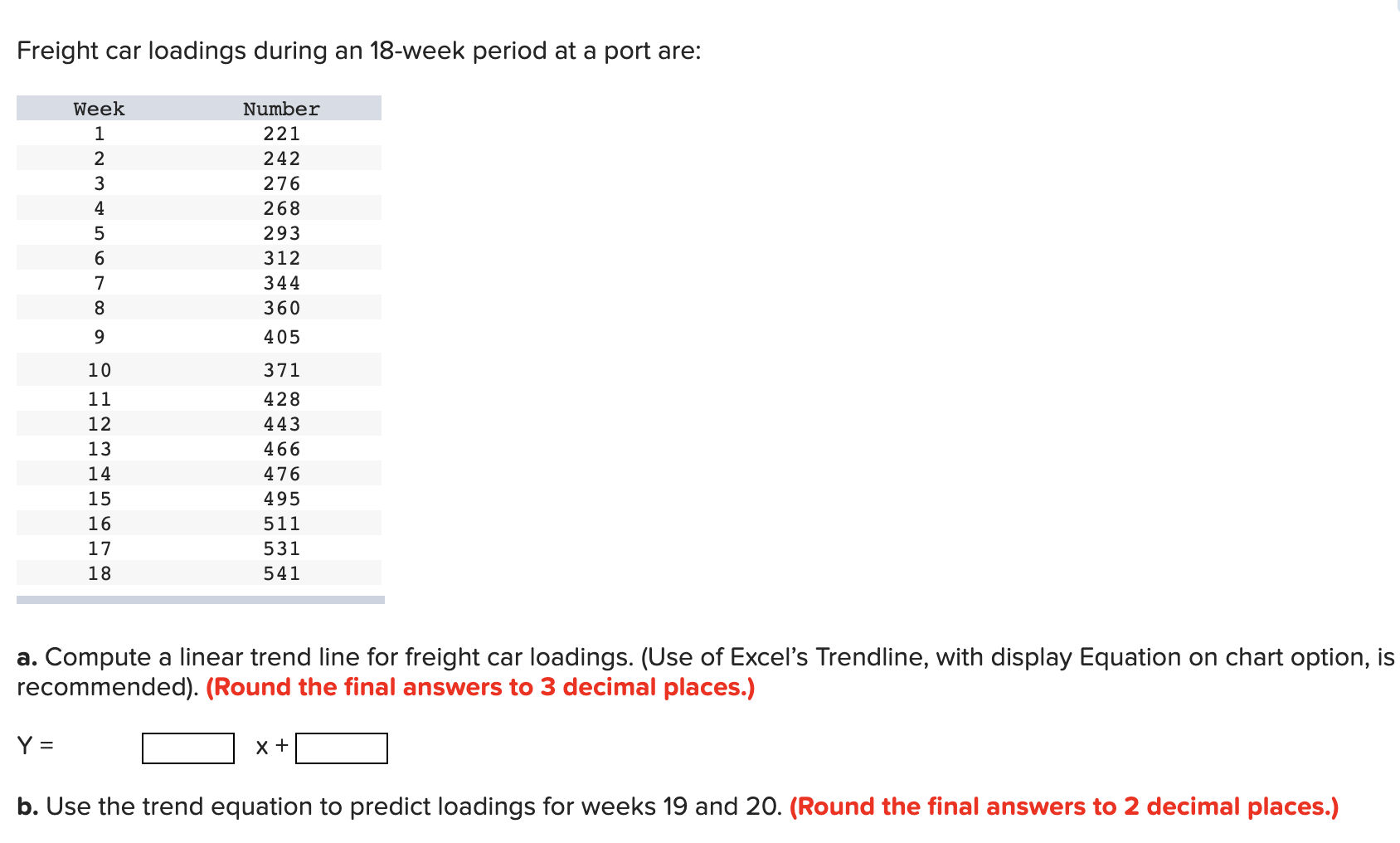 Solved Problem 37 Freight car loadings over an 18week Freight Car Loadings Each week's report covers the seven day period ending on saturday. With a single train capable of carrying hundreds of cars, freight rail transports around 75% of the new cars and light trucks. A sample of current weekly, monthly and annual information on freight rail traffic is in the interactive charts below. Rail traffic is disaggregated between carload (traffic moving. Freight Car Loadings.