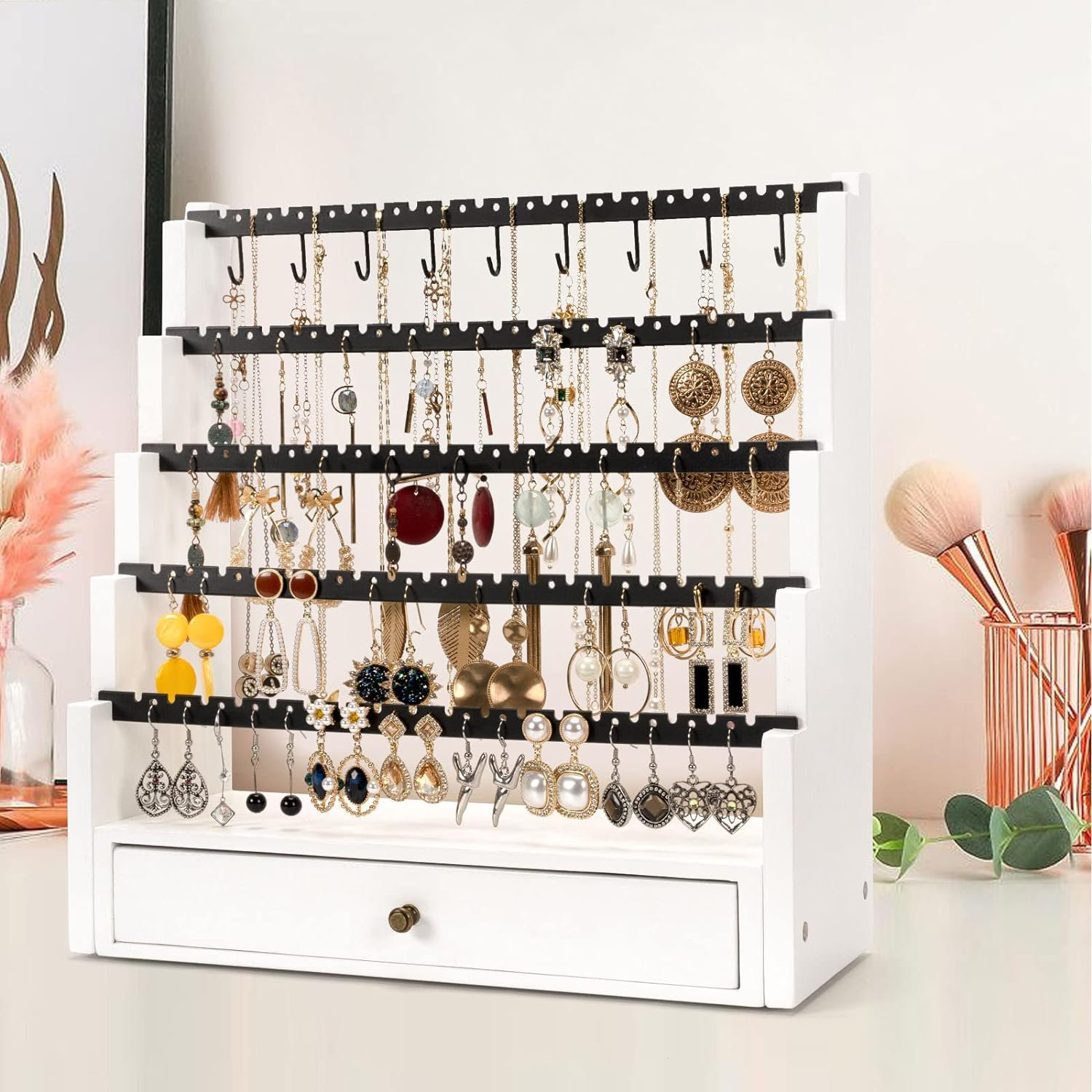 Emfogo Jewelry Organizer Stand Wood Basic Jewelry Drawer Storage Box with Double Rods & 6 Tier Jewellery Stand With Drawer Maximize your space with our compact yet efficient jewelry organizers. Maximize your space with our compact yet efficient jewelry organizers. Sitting easily on any dresser, table or counter top surface, this brass tone metal and mango wood jewelry hanger display stand keeps your. Check out our jewelry stands with drawers selection for the very best in unique or custom, handmade. Jewellery Stand With Drawer.