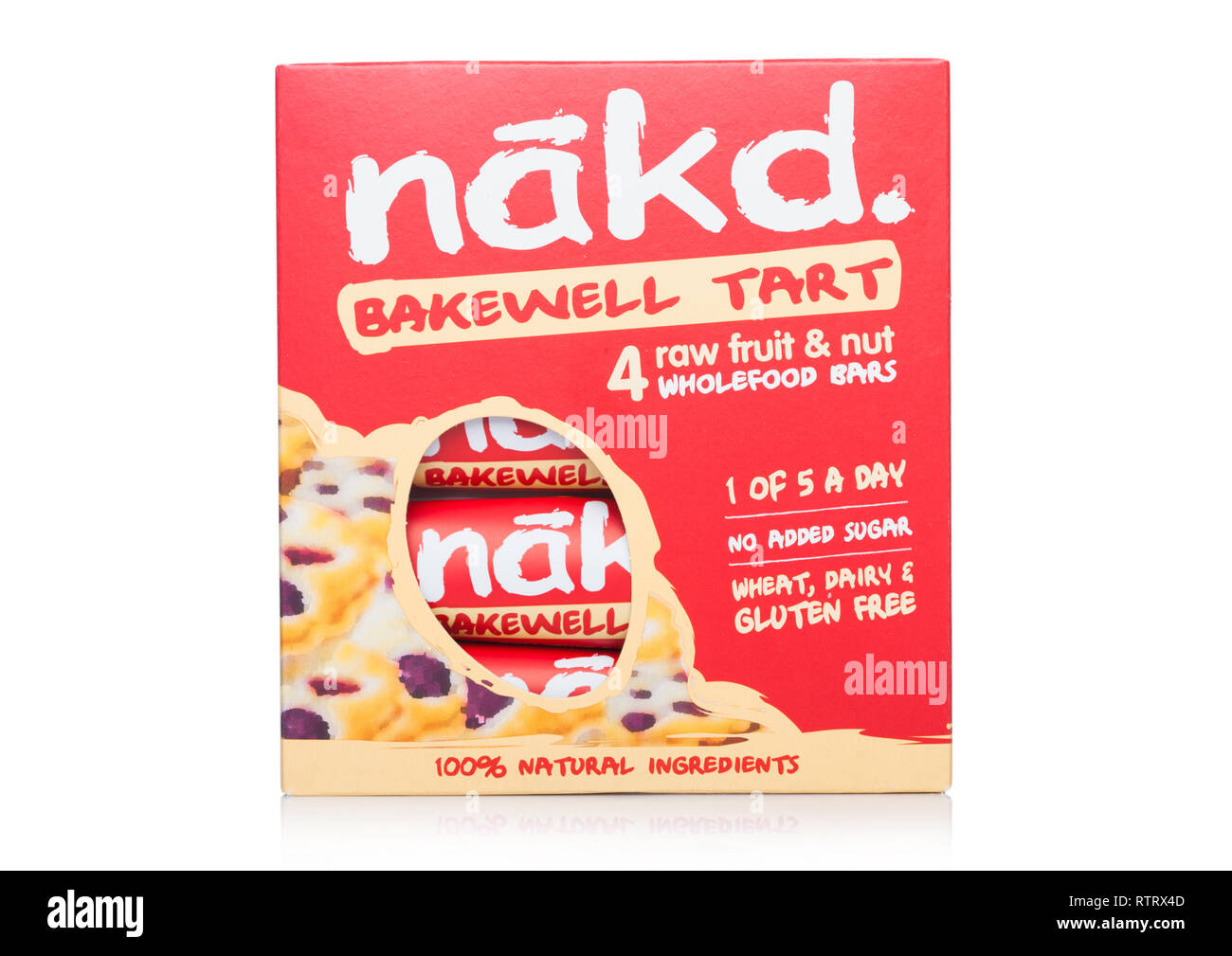 LONDON, UK MARCH 01, 2019 Pack of NAKD Raw Fruit and Nut Wholefood Bars with Bakewell Tart on