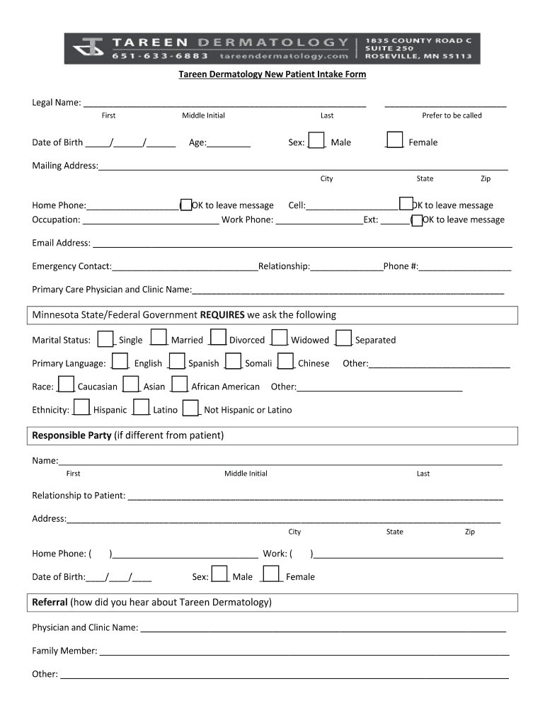 Fillable Online Tareen Dermatology New Patient Intake Form Fax Email