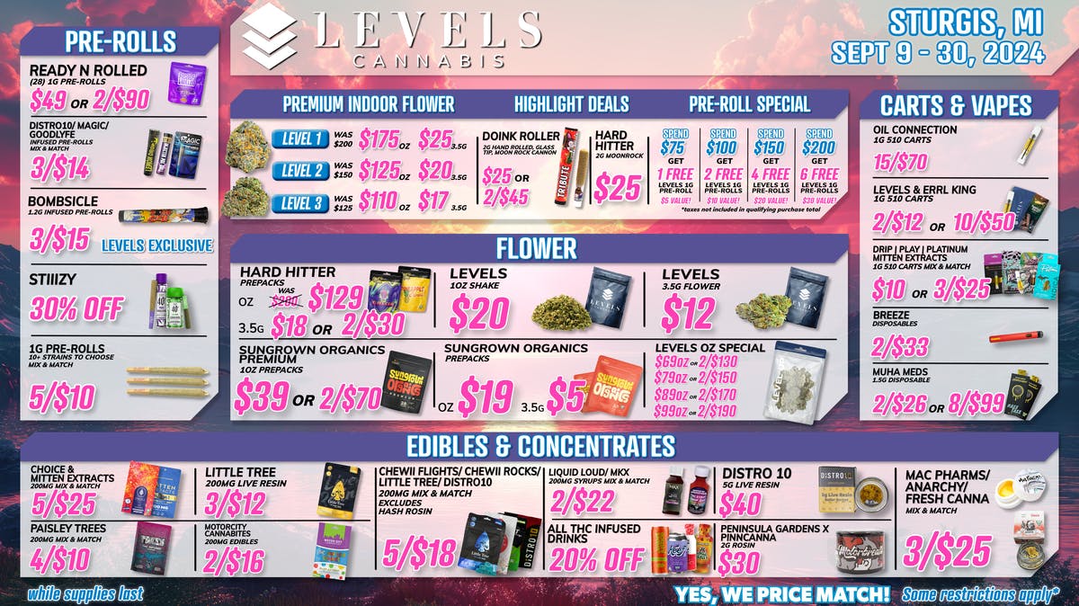 WE PRICE MATCH at Levels Cannabis Sturgis Weedmaps