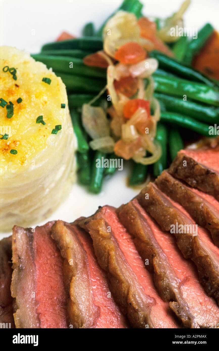 Rare Roast Beef, dauphinoise potatos and green beans with an onion and