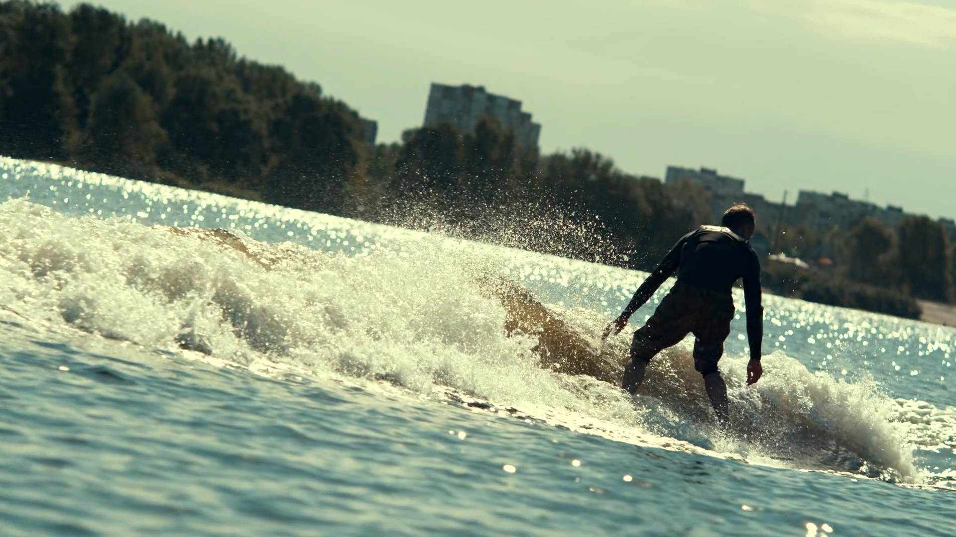 Athletic man wake surfing on waves in slow motion. Sportsman in wetsuit
