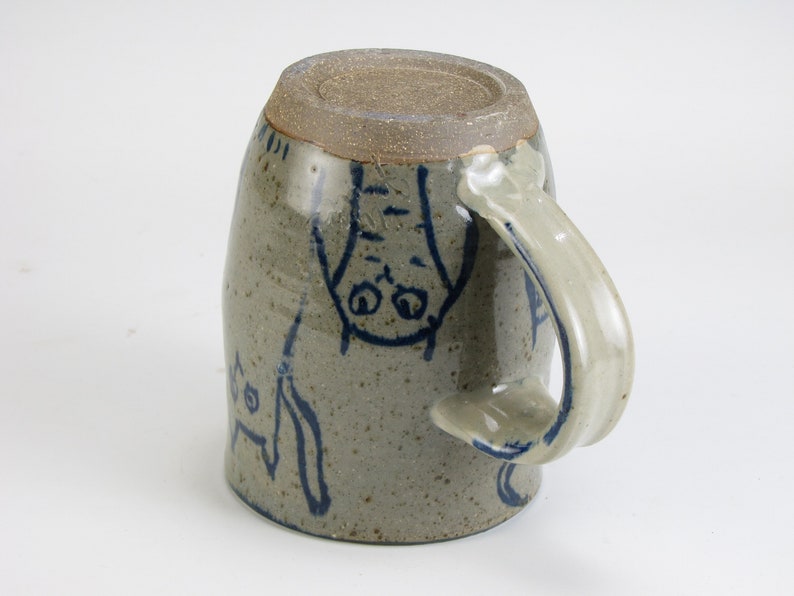 Mug Owl and Painted Cat Cup Greenish Glazed Stoneware Wheel Thrown Mug