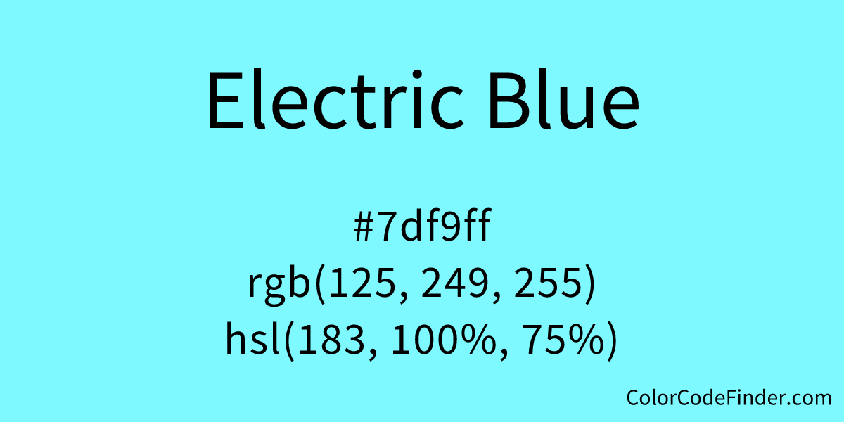 electric blue is a bright, brilliant blue with the hex code #7df9ff, originally named to represent the color of lightning and other. basic facts about this digital color. the hexadecimal rgb code of electric blue color is #7df9ff and the decimal is rgb(125,249,255). electric blue is a vivid and vibrant hue ranging from sky blue to aqua. Hex #7df9ff color name is electric blue. The electric blue color hex code is #7df9ff. Electric blue is a bright, vivid shade of blue. in a rgb color space, hex #7df9ff (also known as electric blue) is composed of 49% red, 97.6% green and 100% blue. what color is electric blue? Electric blue is often used.