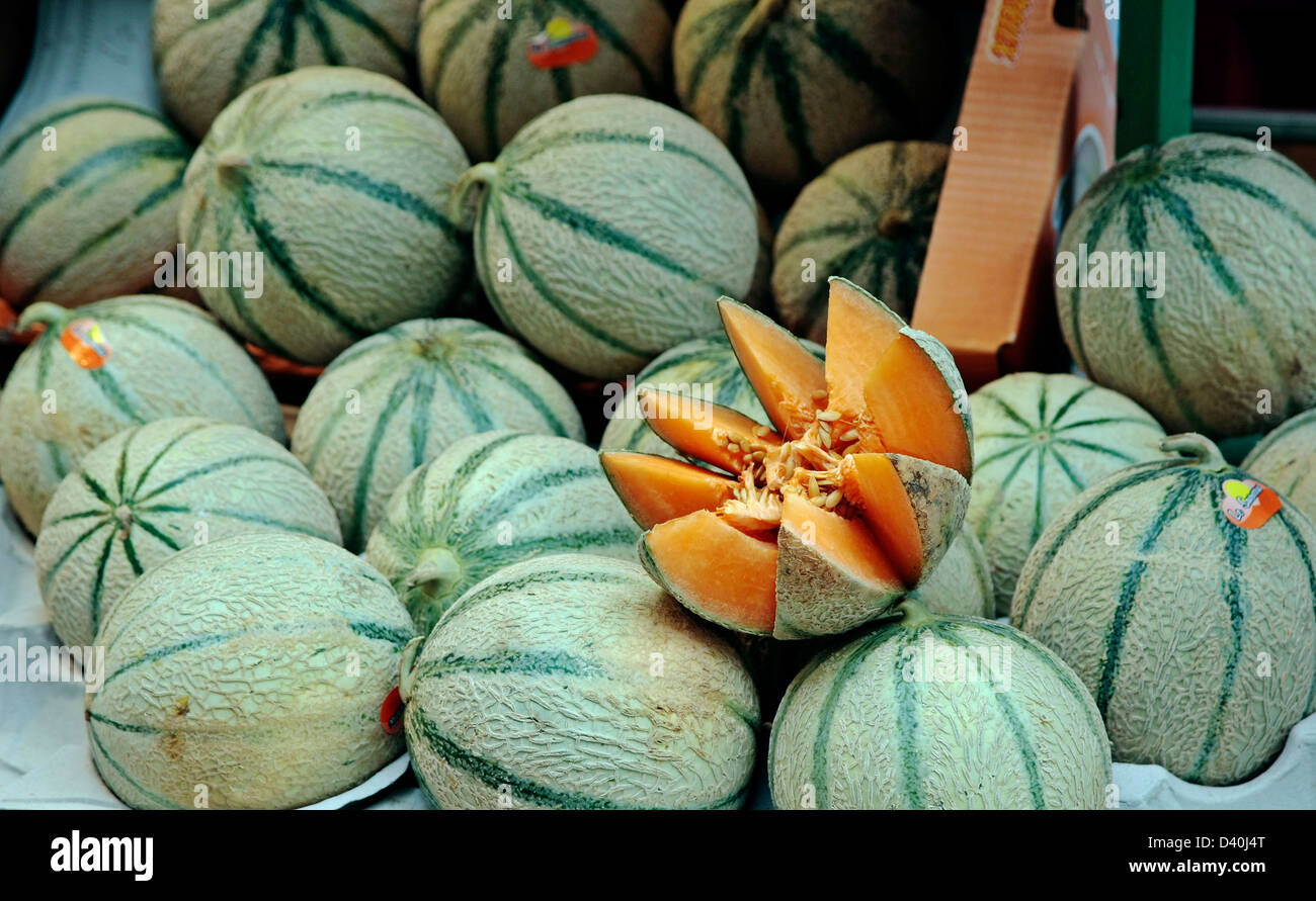 CharentaisMelon Charentais mellons on display on a market stall Stock