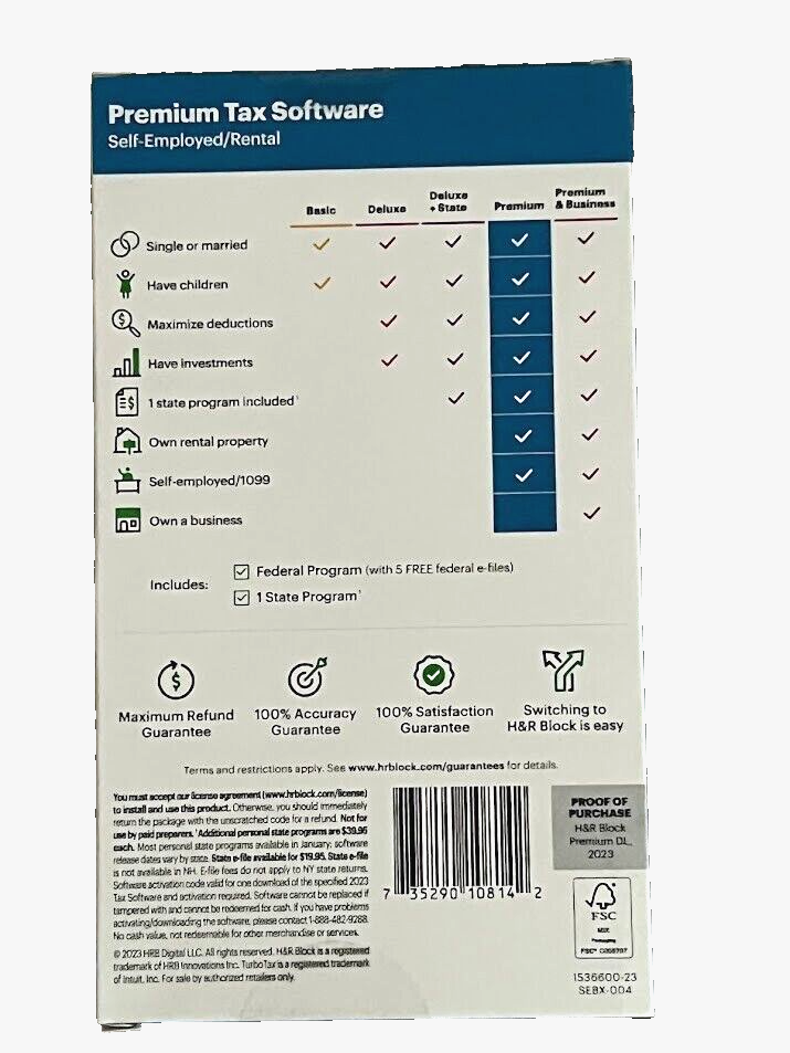 H&R Block Tax Software Premium 2023 Windows (PC) / Mac Key Card Box New