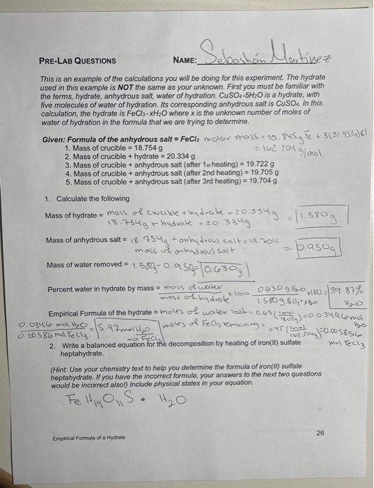 Solved Seboston Martinez PRELAB QUESTIONS NAME This is an Crucible Hydrate Lab Place a sample of the hydrate. Investigation of the properties of hydrates. The goal of this part of the experiment is to determine the value of x in the formula. A hydrate of magnesium chloride is present and the following data is collected: Hydrates are salts that incorporate water in their crystal. Identification of hydrates in a group of compounds.. Crucible Hydrate Lab.