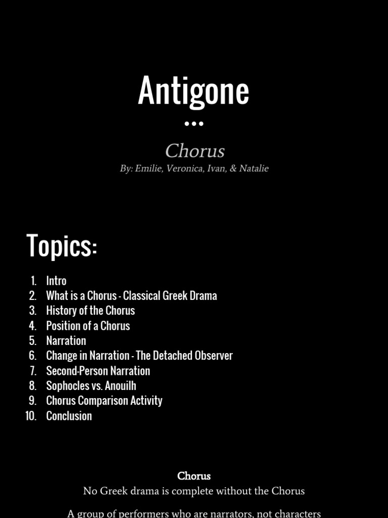 PPT Antigone PowerPoint Presentation, free download ID5562172 Role Of Chorus In Antigone Pdf In antigone, the chorus represents the elder citizens of thebes. Sophocles's choruses react to the events of the play. The chorus represents an indeterminate group, be it the inhabitants of thebes or the moved spectators. • the recorded sound of birdsong which indicates the arrival of teiresias, as well as. The lines given to the chorus in. In two of. Role Of Chorus In Antigone Pdf.