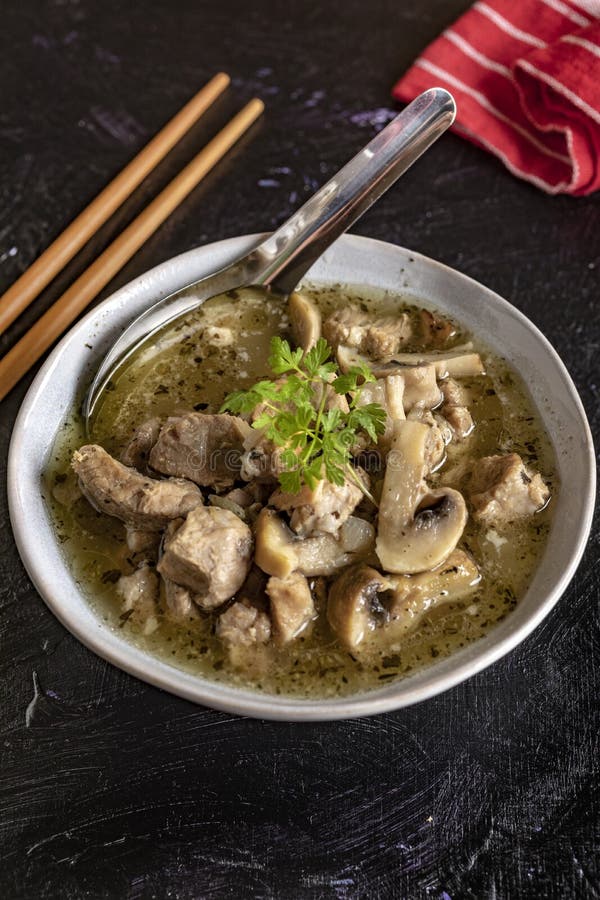 Soup with Pieces of Pork and Mushrooms. Stock Image Image of fresh