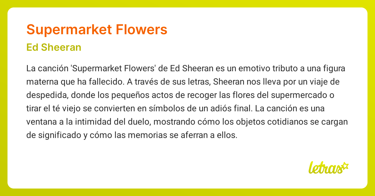 Supermarket Flowers' - Ed Sheeran Ed sheeran wrote supermarket flowers as a tribute to his late grandmother, who passed away during the making of his album. In ‘supermarket flowers,’ sheeran uses the otherwise mundane task of clearing out a loved one’s belongings as a vehicle for expressing the profound sense of loss. This tab follows the piano chords on the album. I took the supermarket. Supermarket Flowers' - Ed Sheeran.