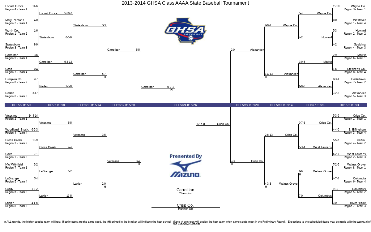 20132014 GHSA Class AAAA State Baseball Tournament Ghsa Brackets Baseball The 2025 ghsa state baseball championships will be held on varying dates from may 19 through may 21. Here is a look at this season's current baseball statewide stat leaders in batting average, home runs, rbi, runs, batters struck out and era. View the entire 2024 ghsa class 7a state baseball championships varsity baseball playoff bracket. Baseball québec's official spordle. Ghsa Brackets Baseball.