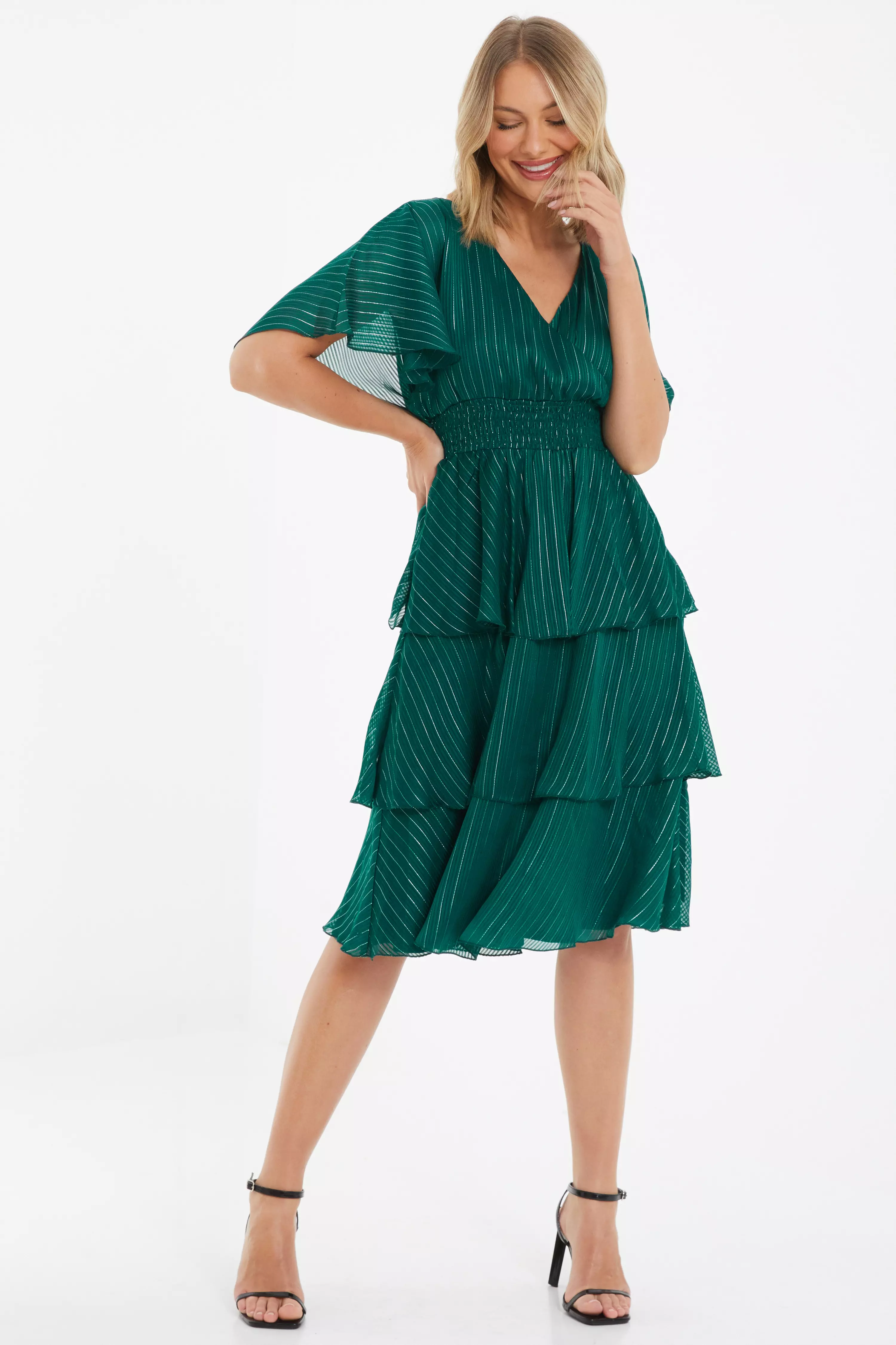 Green Glitter Chiffon Tiered Midi Dress QUIZ Clothing