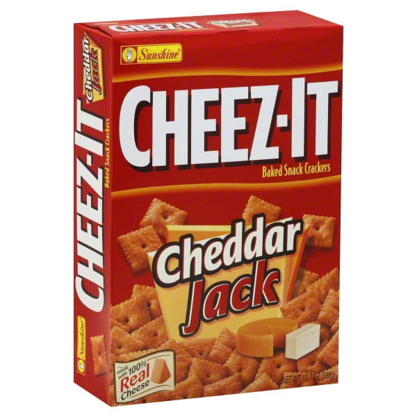 CheezIt Baked Snack Cheese Crackers, Cheddar Jack, 12.4oz Walmart Cheese It Cheddar Jack Deliciously cheesy, light and crispy cheddar jack snack. Deliciously cheesy, light and crispy cheddar jack snack crackers made with 100% real cheese. Our cheesy, extra toasty crackers are packed for convenience. Cheese It Cheddar Jack.