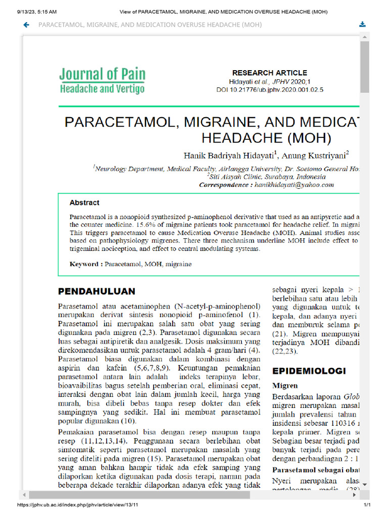 Paracetamol, Migraine, and Medication Overuse Headache (Moh) PDF