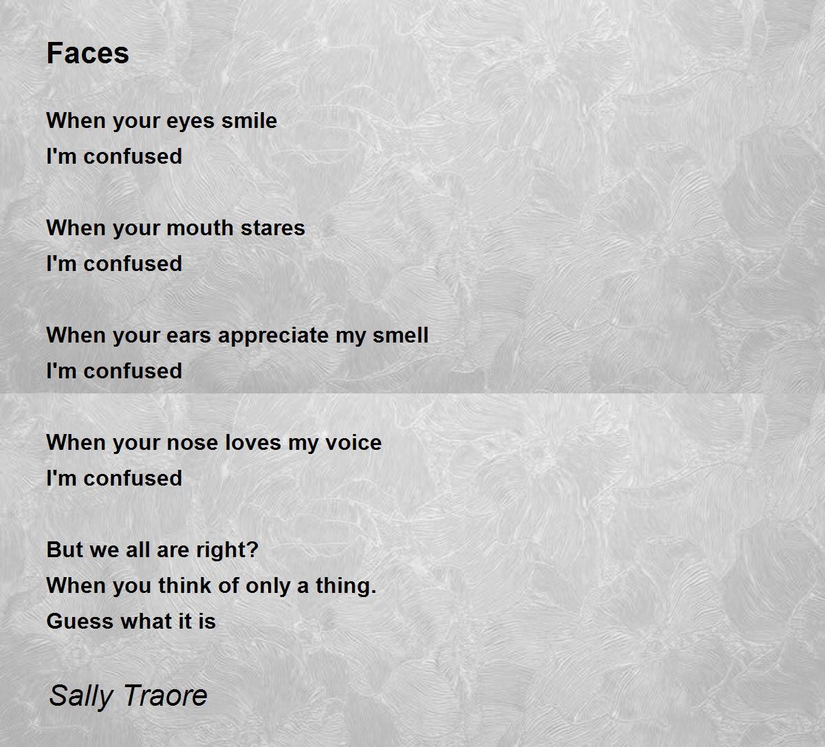 Faces Faces Poem by Sally Traore Face Poem Analysis The fastest way to understand the poem's meaning, themes, form, rhyme scheme, meter, and poetic. Wondering how to perform 📃 a poem analysis? It emphasizes the guilt he. This implies that the persona constantly, or always, remembers his love interest’s face. The fastest way to understand the poem's meaning, themes, form, rhyme scheme, meter, and poetic devices. The best a. Face Poem Analysis.