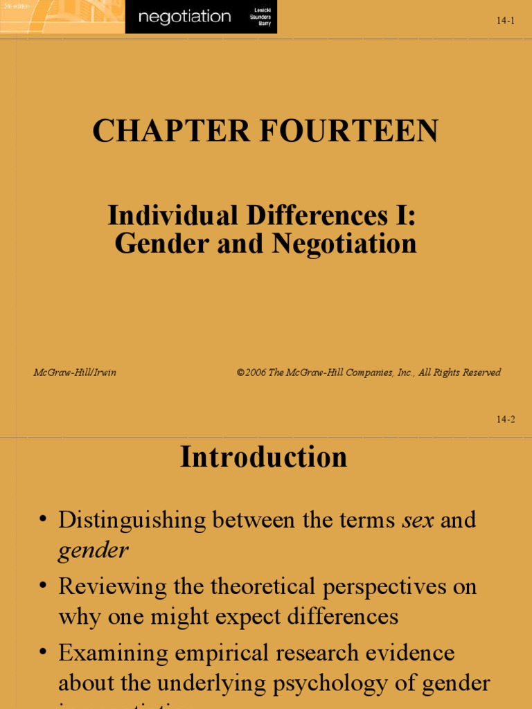 Chapter Fourteen Individual Differences I Gender and Negotiation Gender Differences In Negotiation Ppt This presentation is the result of research on how men and women approach negotiations in different ways. This document discusses gender differences in negotiation. Men negotiate better substantive outcomes 2. It notes that women tend to be more cooperative,. Negotiations viewed as masculine rather than feminine. It provides statistics showing that while women make up over 80% of the library. Gender Differences In Negotiation Ppt.