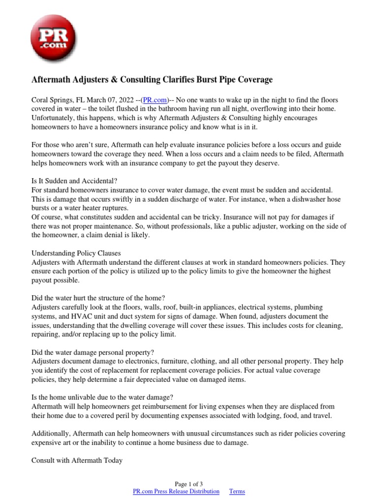 Aftermath Adjusters & Consulting Clarifies Burst Pipe Coverage PDF